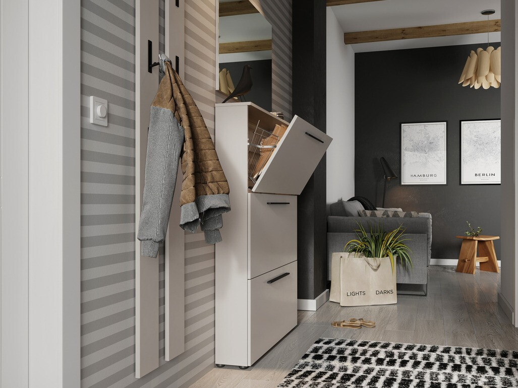 Mūsdienu dizaina priekšnama mēbeļu kolekcija iepriecinās ikvienu moderna dizaina cienītāju. Šo kolekciju papildina gari metāla rokturi melnā krāsā, kas lieliski iekļaujas mēbeļu dizainā. Mēbeles ir viegli kopjamas, jo ir pārklātas ar bezkrāsainu materiālu, kas pasargā tās no sīkiem skrāpējumiem un ļauj viegli notīrīt uzkrātos netīrumus. Mēbeļu malas ir pārklātas ar apdares lenti, kas izgatavota no stipras plastmasas un pasargā mēbeles no nelieliem bojājumiem. Atvilktnēm un durvīm ir kluss aizvēršanās mehānisms, kas ir īpašs ar to, ka pasargā tās no ātras aizvēršanās. Šaurie skapji lieliski iederēsies Jūsu mājas dizainā, un tajos esošie metāla apavu turētāji nodrošinās ērtu apavu uzglabāšanu. Funkcionalitāte un ērtība ir šīs Vācijā ražotās kolekcijas neatņemamas iezīmes. Izveidojiet mūsdienu vidi ar šo mēbeļu kolekciju.
