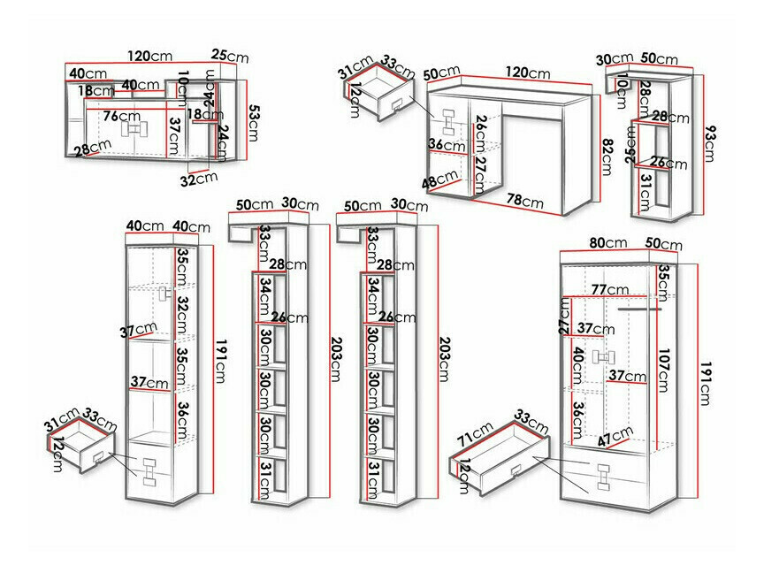 191 x 40 x 40; 203 x 50 x 30 cm