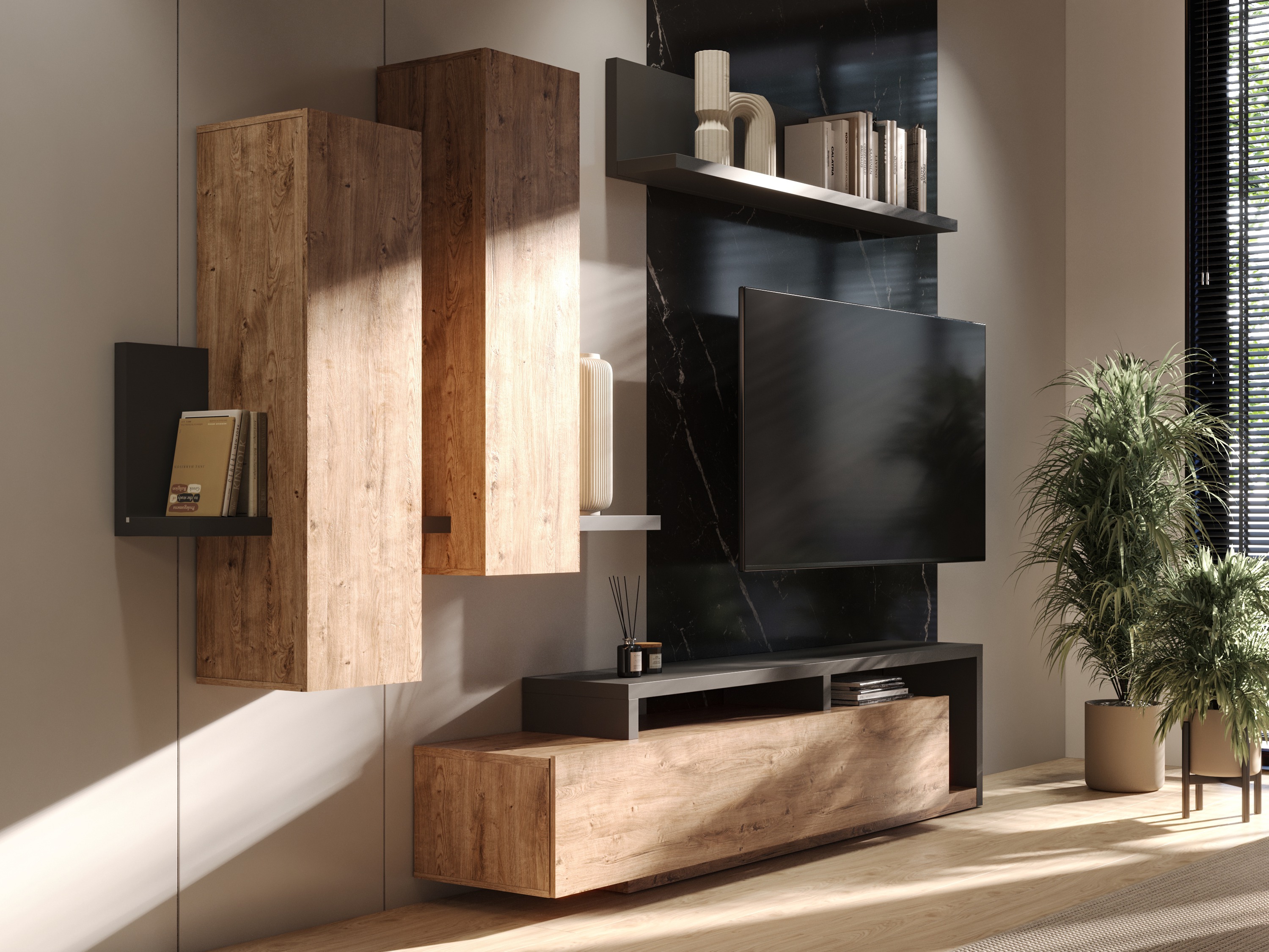 Kolekcija ir lieliski piemērota mājām, kurās vienmēr ir laipni gaidīti viesi. Vairāki krāsu varianti ļauj izveidot dažādas kompozīcijas. Baltas un pelēkas mēbeļu krāsas ir ideālas industriāla stila interjeram. Pelēkās virsmas, kas imitē akmens struktūru, izskatās ļoti eleganti kombinācijā ar matētu balto krāsu. Mēbeles ar dabīgā koka rakstiem un grafīta krāsu elementiem uzsvērs jūsu interjera unikalitāti. Baltās krāsas un koka kombinācija lieliski iederēsies skandināvu stila interjerā. Viesistabas mēbeļu standarta komplektā ietilpst mūsdienīgs, enerģiju taupošs plauktu apgaismojums, kas palīdzēs radīt mājīgu un romantisku atmosfēru jūsu mājās.
