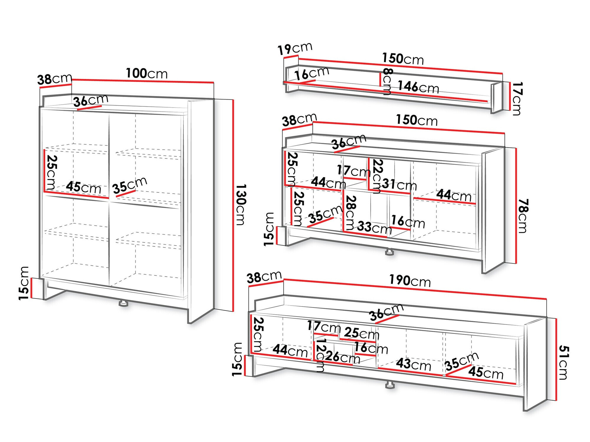 130 x 100 x 38; 78 x 150 x 38 cm