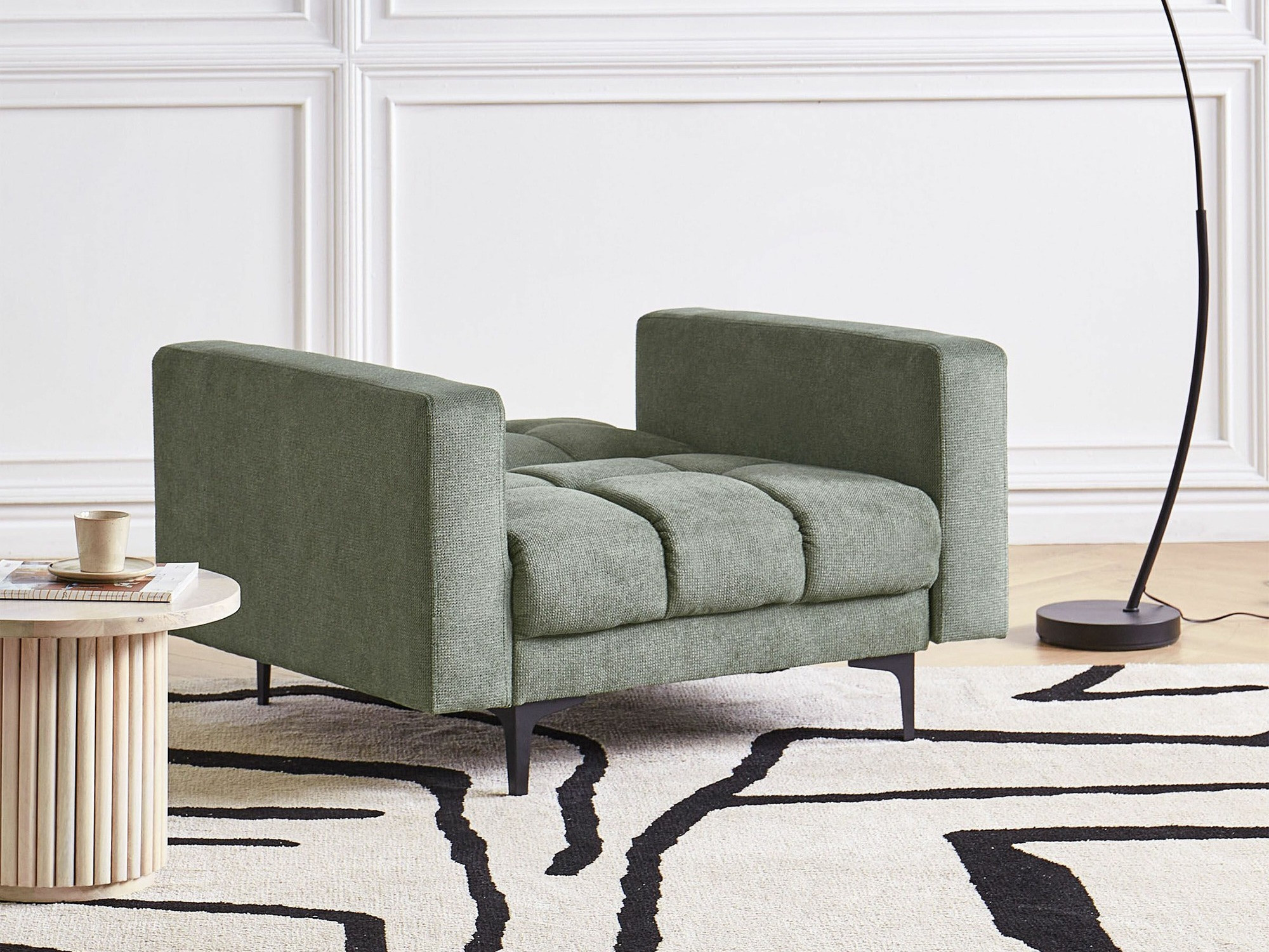 Mēbeļu aizmugures audums neatšķiras no galveno mēbeļu auduma. Jūs varat izvietot mēbeles istabas vidū.