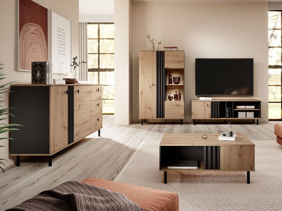 Mēbeļu kolekcija, kas ietver mūsdienīgu dizainu un funkcionalitāti. Ar šo kolekciju var iekārtot ļoti modernu viesistabu vai uzlabot jebkuru citu telpu Jūsu mājās. Mēbeļu estētika un plašums ļauj organizēti un kārtīgi uzglabāt dažādas lietas. Antracīta un "Artisan" ozola krāsa veido unikālu kombināciju, kas moderni izskatīsies jebkurā telpā. Metāla kājas un rokturi piešķir elegantu izskatu un stabilitāti, kā arī nodrošina ērtu lietošanu. Līnijveida dizains rada graciozitātes un viegluma sajūtu. Stikls vitrīnās ir izgatavots no rūdīta stikla, kas ir drošāks un izturīgāks nekā parastais stikls. Visām kolekcijas mēbelēm ir arī aizsargātas malas, un mēbeles ir piemērotas putekļsūcējiem-robotiem.