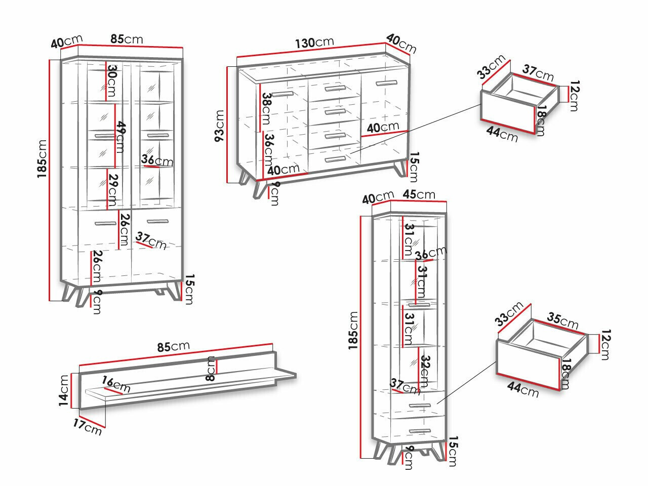 185 x 85 x 40; 185 x 45 x 40 cm