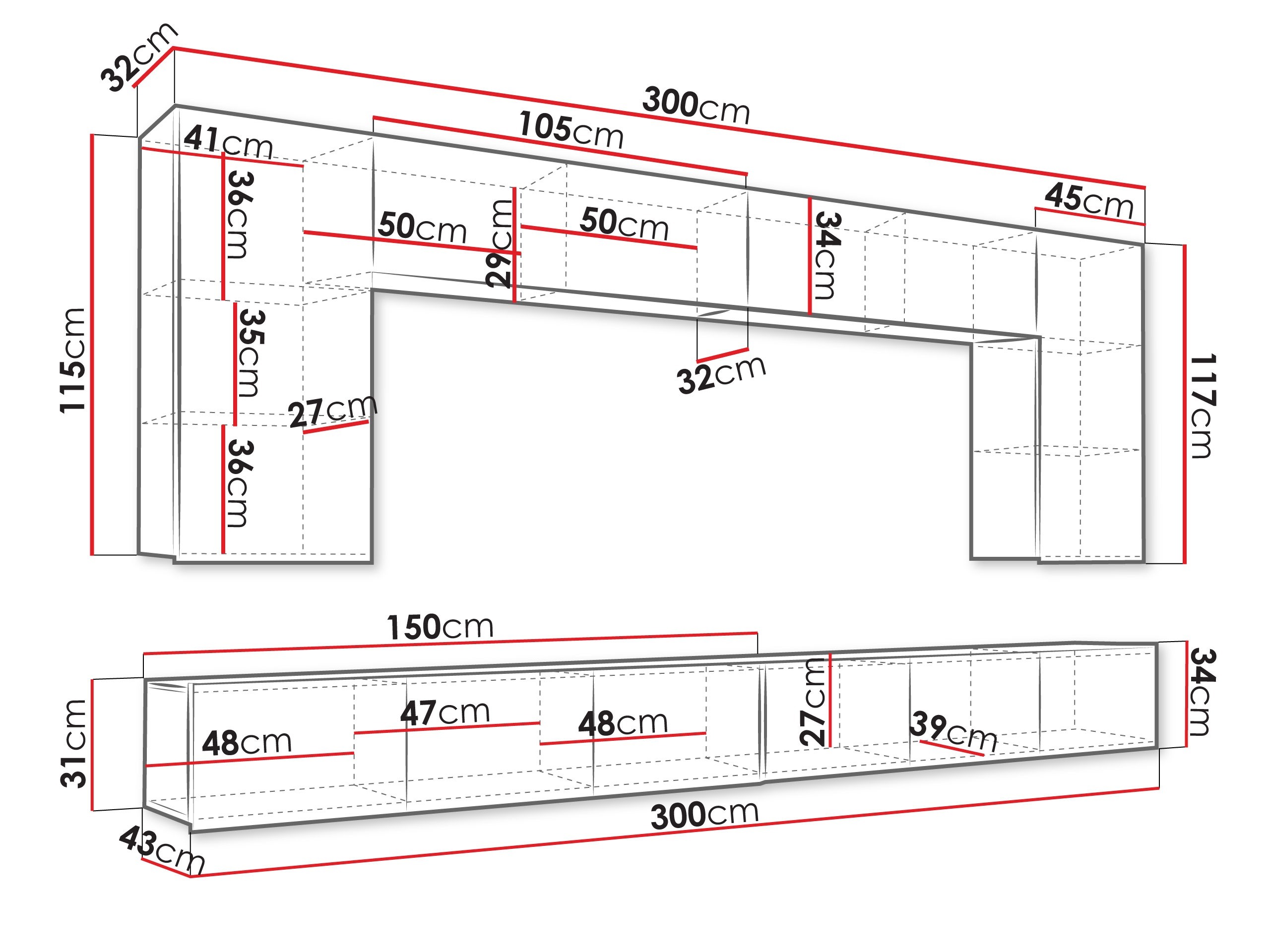 34 x 210 x 32; 115 x 45 x 32 cm
