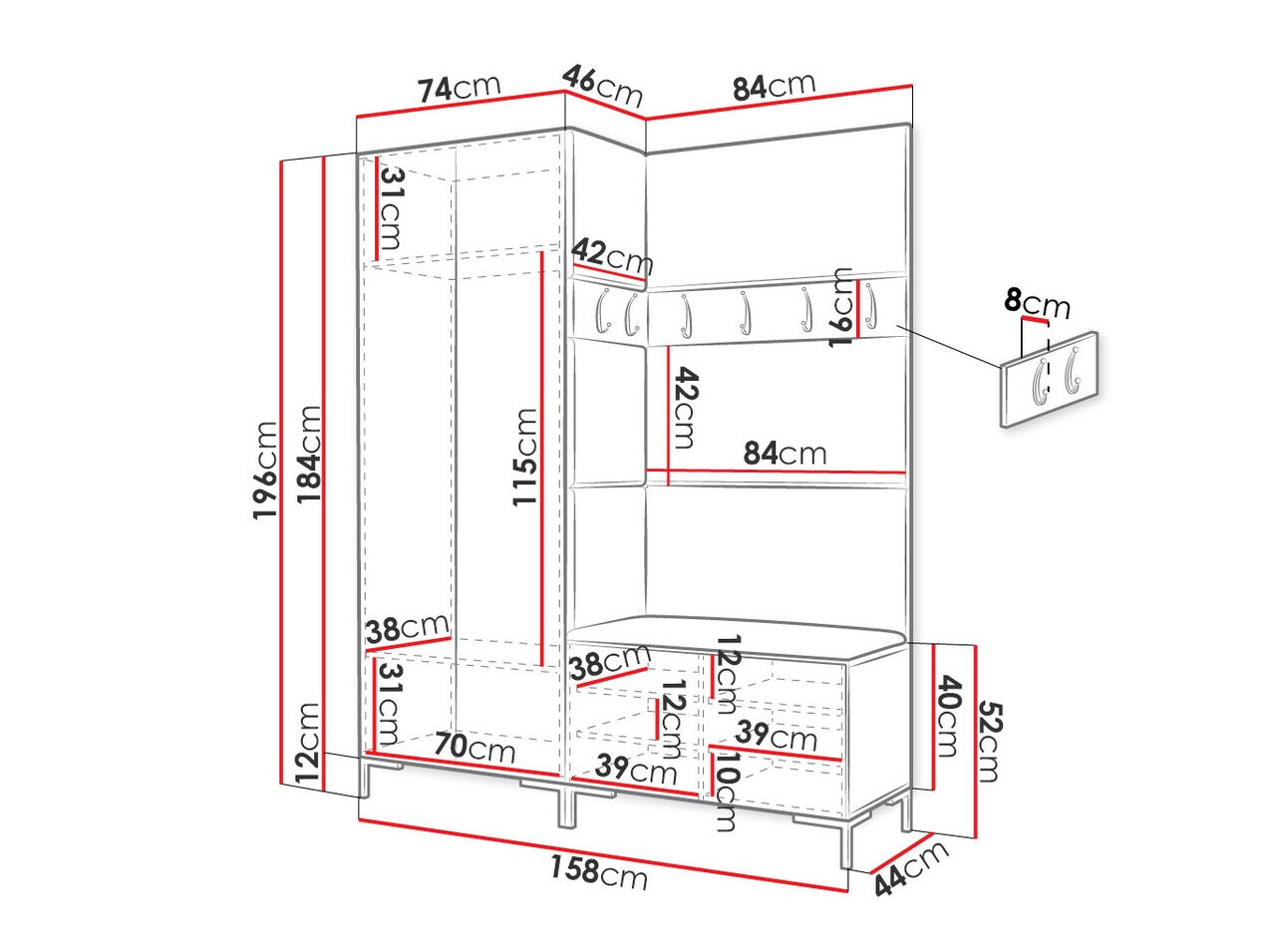 196 x 74 x 46 cm