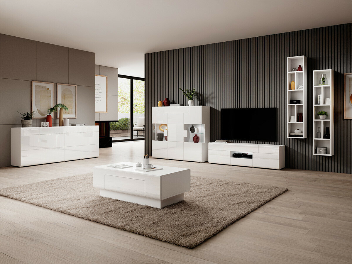 В коллекции представлены шкафы различных размеров, вместительные комоды, полка и журнальный столик. Глянцевая отделка мебели зрительно увеличит комнату. Двери и ящики комода открываются одним щелчком - удобство обеспечивается встроенным механизмом «Push to open»